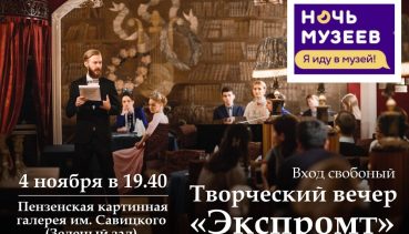 Друзья, с радостью сообщаем вам, что творческий вечер «Экспромт» пройдёт 4 ноября в рамках фестиваля «Ночь музеев» в Пензенской картинной галерее имени Савицкого.