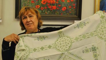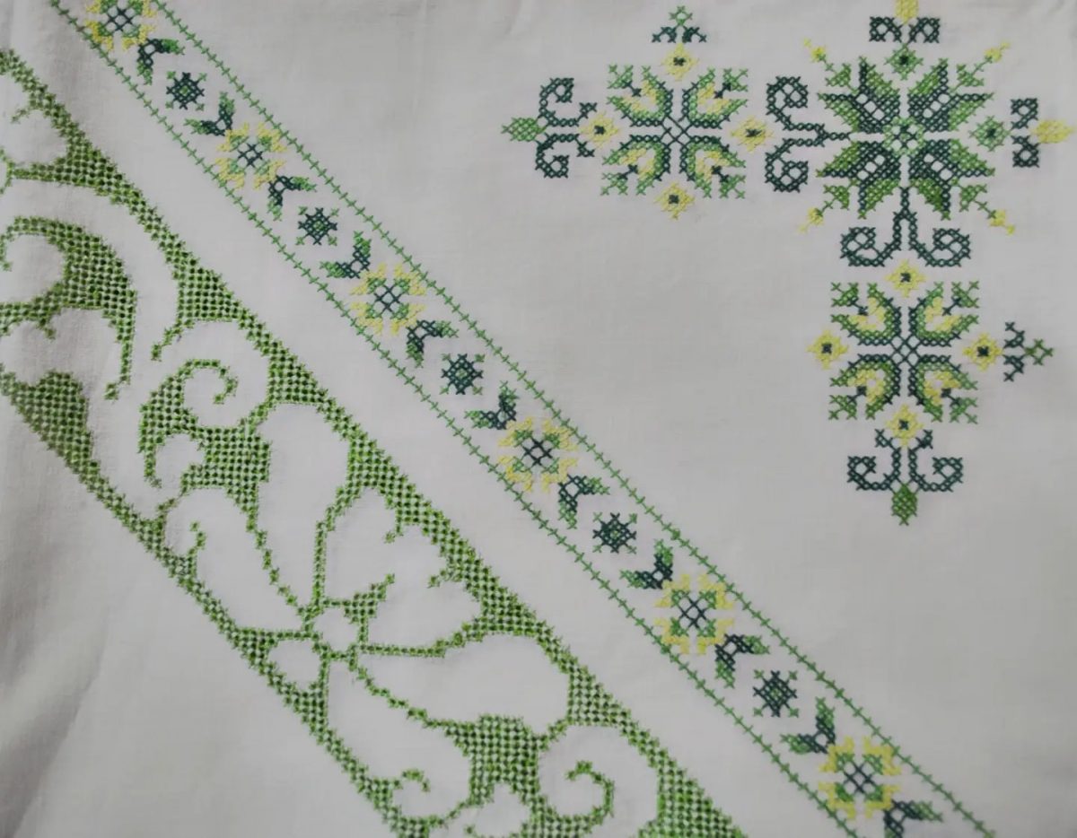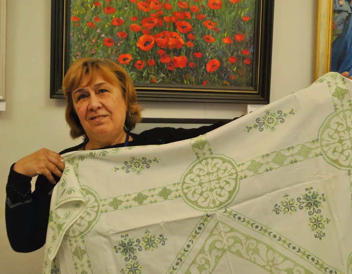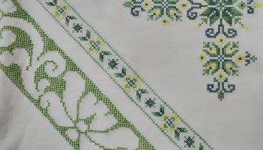 Она передала в фонды музея скатерть и салфетку ручной работы, выполненные в начале 50-х годов прошлого века ее бабушкой. Скатерть буквально вся заполнена растительно-геометрическим орнаментом в технике цветной перевити и вышивки крестом.