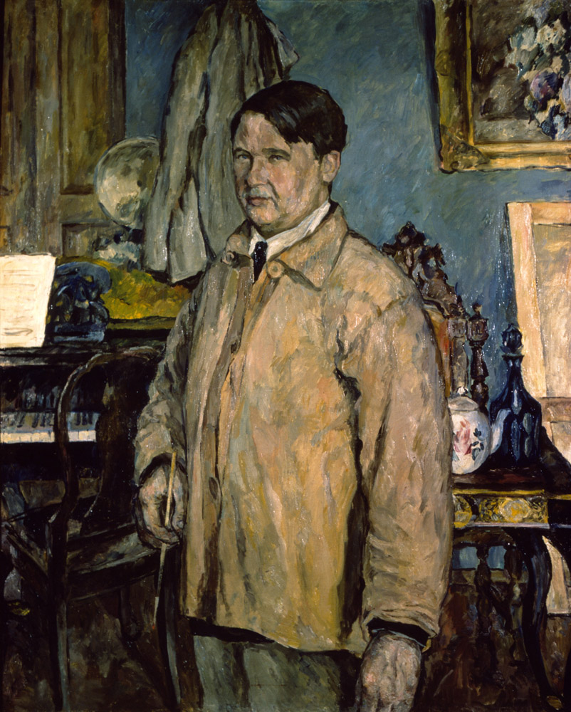 Автор изобразил себя почти в полный рост, в своей домашней мастерской. На нем свободного покроя рабочая блуза, в правой руке кисть. На втором плане законченные картины и прислоненные к стене холсты, открытый рояль с нотами. А.Лентулов страстно любил музыку. Обладая прекрасным слухом, он осмеливался петь в компании с Фёдором Ивановичем Шаляпиным.
