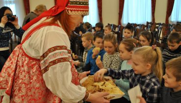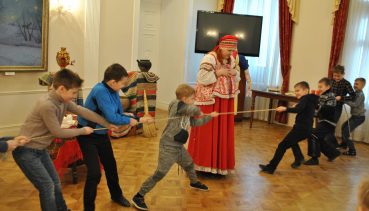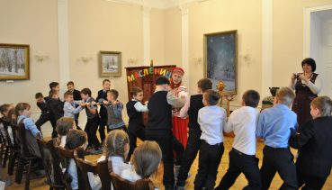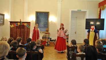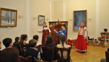 Пятый день Масленичной недели называется Тещины вечерки. Да! «Как ни сладки тещины блинки, теперь тещ угощают зятья». Такой день было принято проводить в кругу семьи и близких друзей, зятья должны не только позвать тещу в гости и угостить блинами, но и приготовить лакомства собственноручно. Ну, а на вечерках теща своим внукам смотр устраивала, разные задания им придумывали, проверяя их смекалку да удаль молодецкую. И к нам, сегодня 16 февраля, на широкий двор картинной галереи пришли ребята из №55, 68 и 32 школ отметить праздник Масленицу, познакомиться с ее традициями и весело поиграть!
