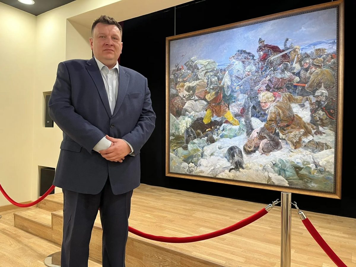 Евгений Анатольевич познакомился с жемчужиной нашей экспозиции — монументальным полотном Владимира Серова «Ледовое побоище». 🛡 Погружение в суровую эпоху Александра Невского стало возможным благодаря просмотру панорамного фильма «Кисть и меч», который традиционно предваряет показ шедевра.