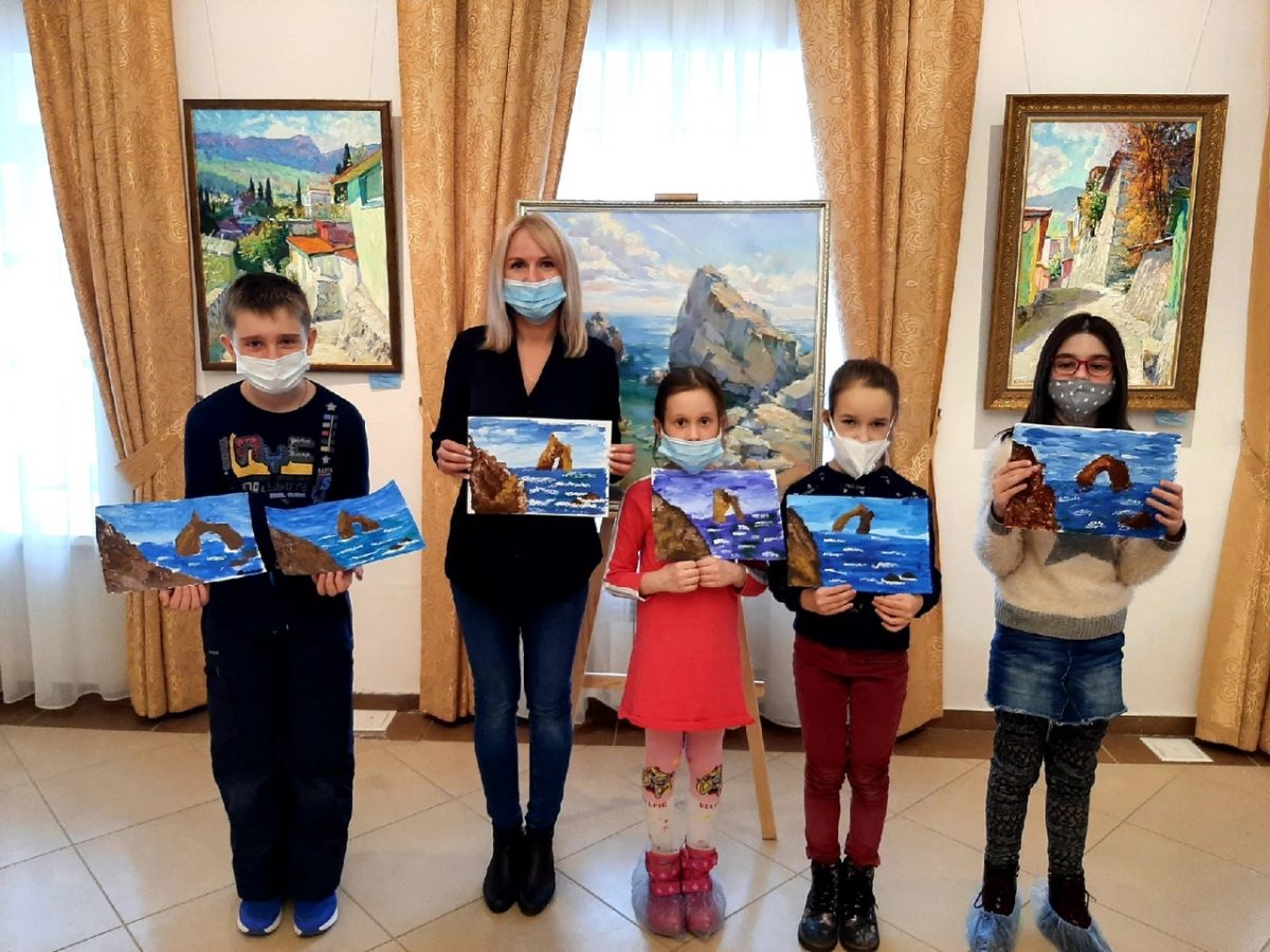 Старшие воспитанники «Школы радости» погружались в атмосферу Крыма. Ребята познакомились с выставкой «Очарованные Крымом», узнали об истории полуострова и о его легендах. С помощью гуашевых красок дети написали визитную карточку Коктебеля, уникальный памятник природы – «Золотые ворота».
