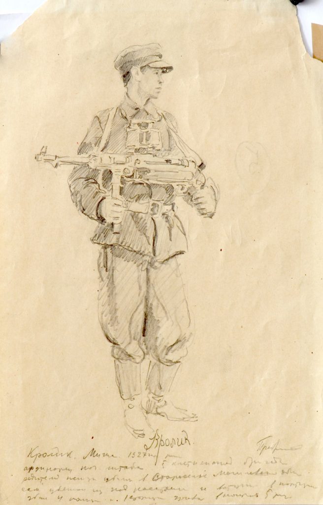 Это не просто портрет, присмотритесь — внизу, рассказана судьба человека — Кролика Миши 1927 года рождения. Торопливо написано там, что родителей его убили в Могилевской области, а сам он сбежал от немцев и влился в ряда защитников Родины. Написано быстро, неразборчиво..Жаль многих слов прочитать не удалось. Может сможете Вы?