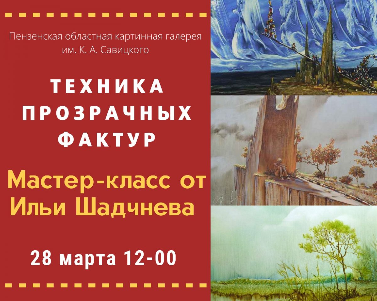?28 марта в 12-00 в главном корпусе Пензенской картинной галереи состоится мастер-класс «Техника прозрачных фактур (приёмы и инструменты)», который проведет известный пензенский художник Илья Шадчнев.