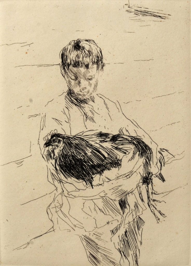 Посмотрите на эту работу. Так просто. Крепко, уверенно, умело держит мальчик в руках курицу. а она и не думает вырываться. Посмотрите, как внимательно смотрит на нее мальчик. О чем думает он в этот момент? Что будет дальше? Чем дольше всматриваешься, тем больше замечаешь деталей, тем больше мыслей возникает в голове. Высочайшее мастерство автора вовлекает внутрь работы. Можно представить двор.. других кур.. людей.. представить целую эпоху..