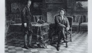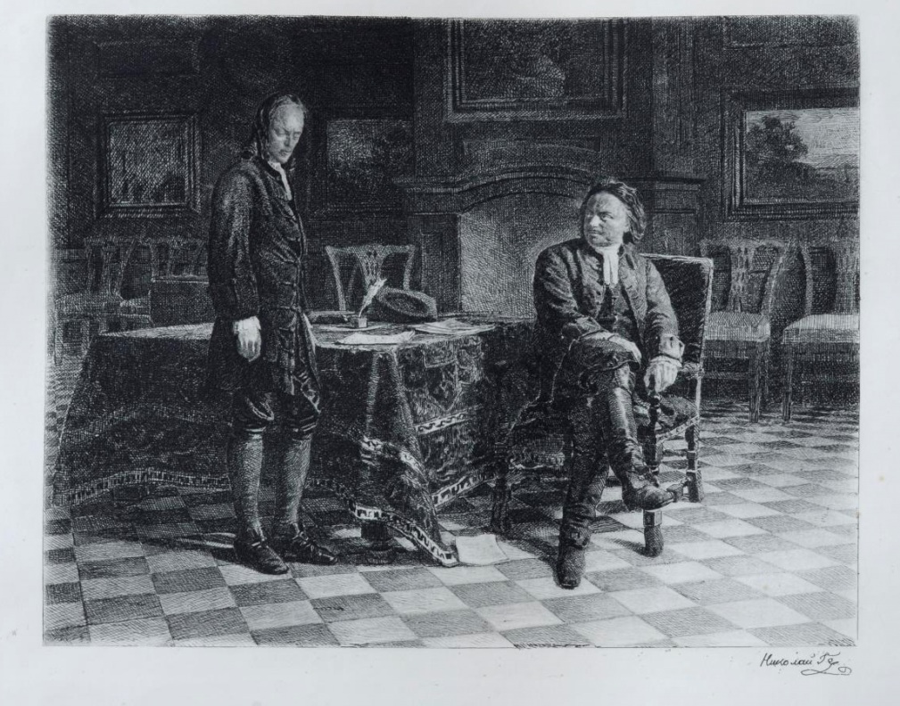 В собрании Пензенской картинной галереи им. К.А.Савицкого хранится несколько офортов Н.Н.Ге, в том числе офорт по мотивам известной картины «Петр I допрашивает царевича Алексея Петровича в Петергофе».