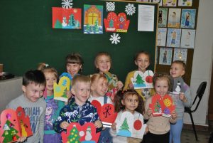 Сегодня дети в старших и младших группах «Школы радости» в технике аппликации создали волшебную рукавичку и избушку Деда Мороза.