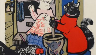 Соловьева Галина Сергеевна (1908-1984), Фатеева Ирина Анатольевна (1908). Кошечка ширинку шьет. 1965 Бумага, цветная линогравюра. 42,5х34,8; 56,7х45,5. см.