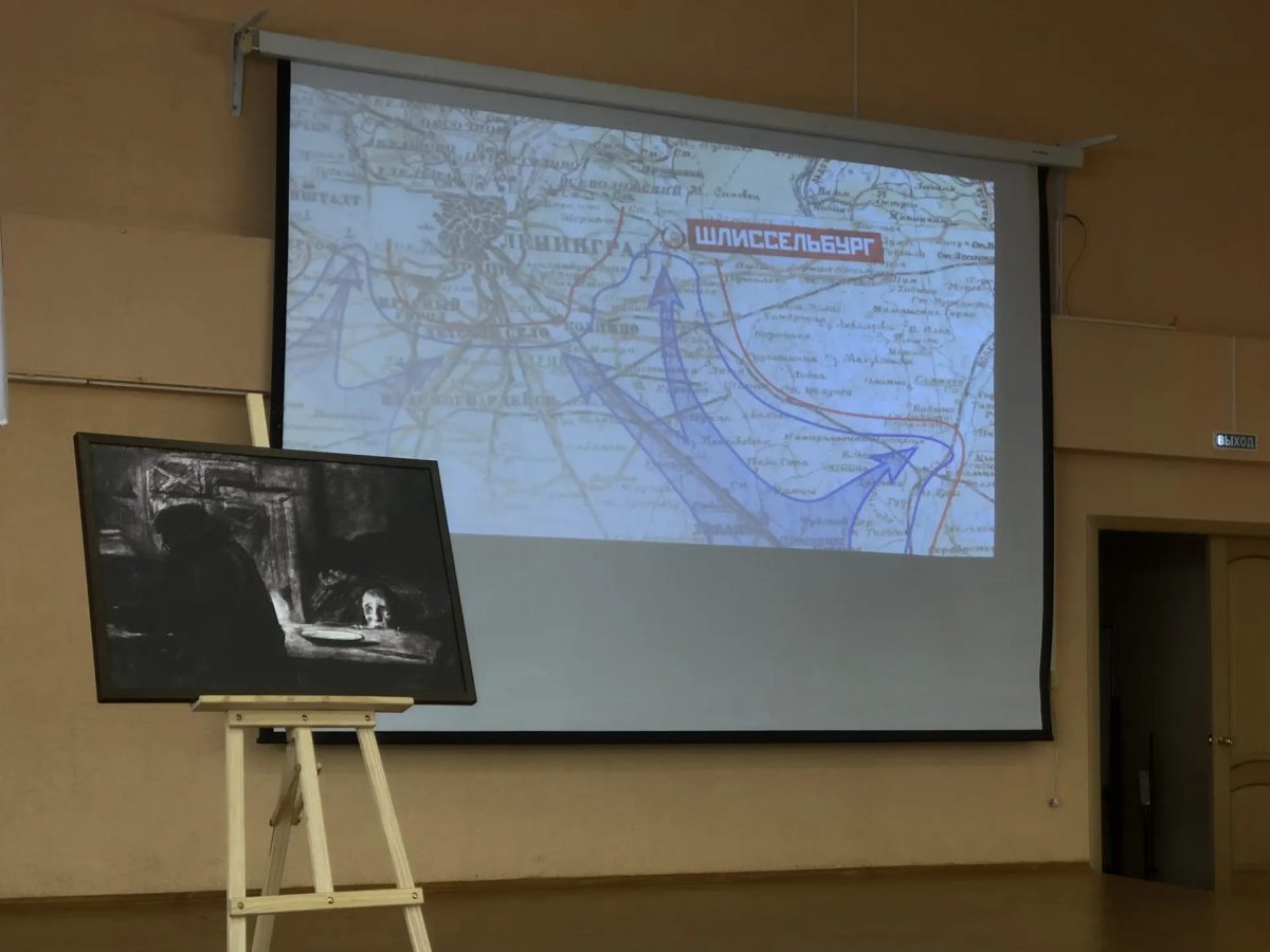 Специалист музея Людмила Пантелеева провела для учащихся «Урок беспримерного подвига». На встрече говорилось не только о сражениях, но и о «тихом мужестве» ленинградцев — их культурной жизни в осаждённом городе. Школьники узнали, как искусство помогало жить, и познакомились с творчеством художников В.А. Серова, И.Я. Билибина и других значимых творцов того героического времени. Центральным экспонатом передвижной выставки стала знаковая работа И.С. Глазунова «Блокада».