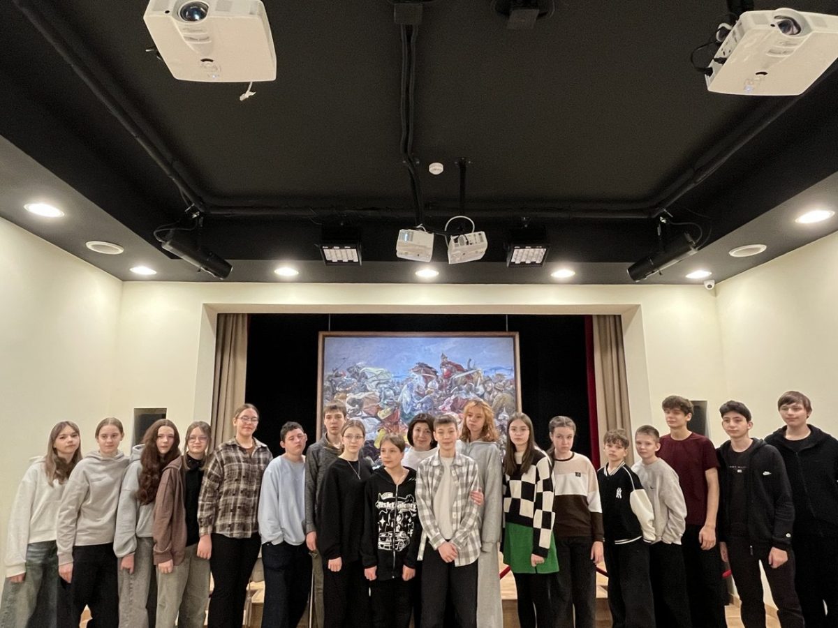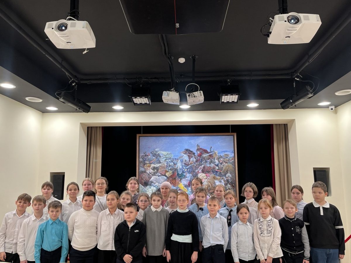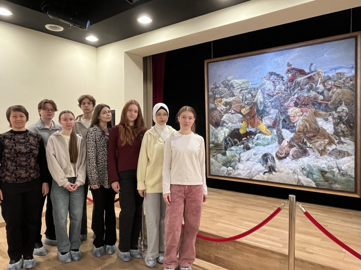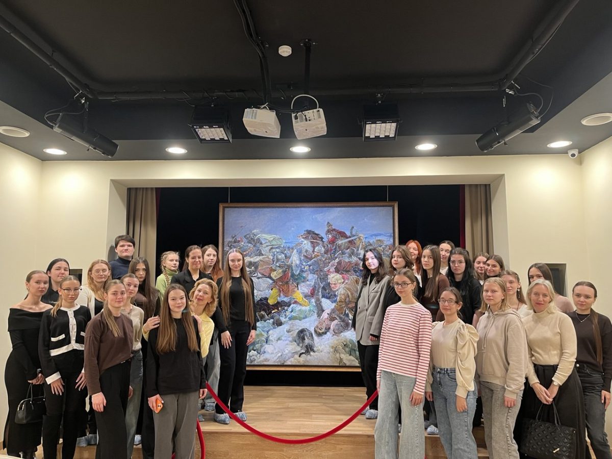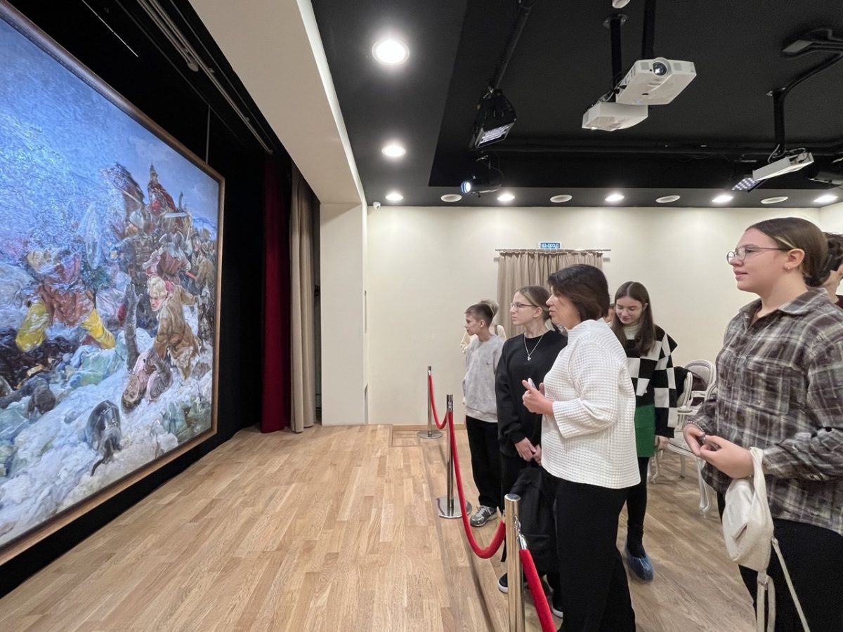 Культурное погружение началось с завораживающего панорамного фильма «Кисть и меч», который открыл перед посетителями художественный мир Владимира Серова и показал героический подвиг русского народа. Этот фильм стал идеальной подготовкой к встрече с монументальным шедевром В.А. Серова «Ледовое побоище» и позволил каждому ощутить всю глубину и драматизм запечатленных исторических событий.