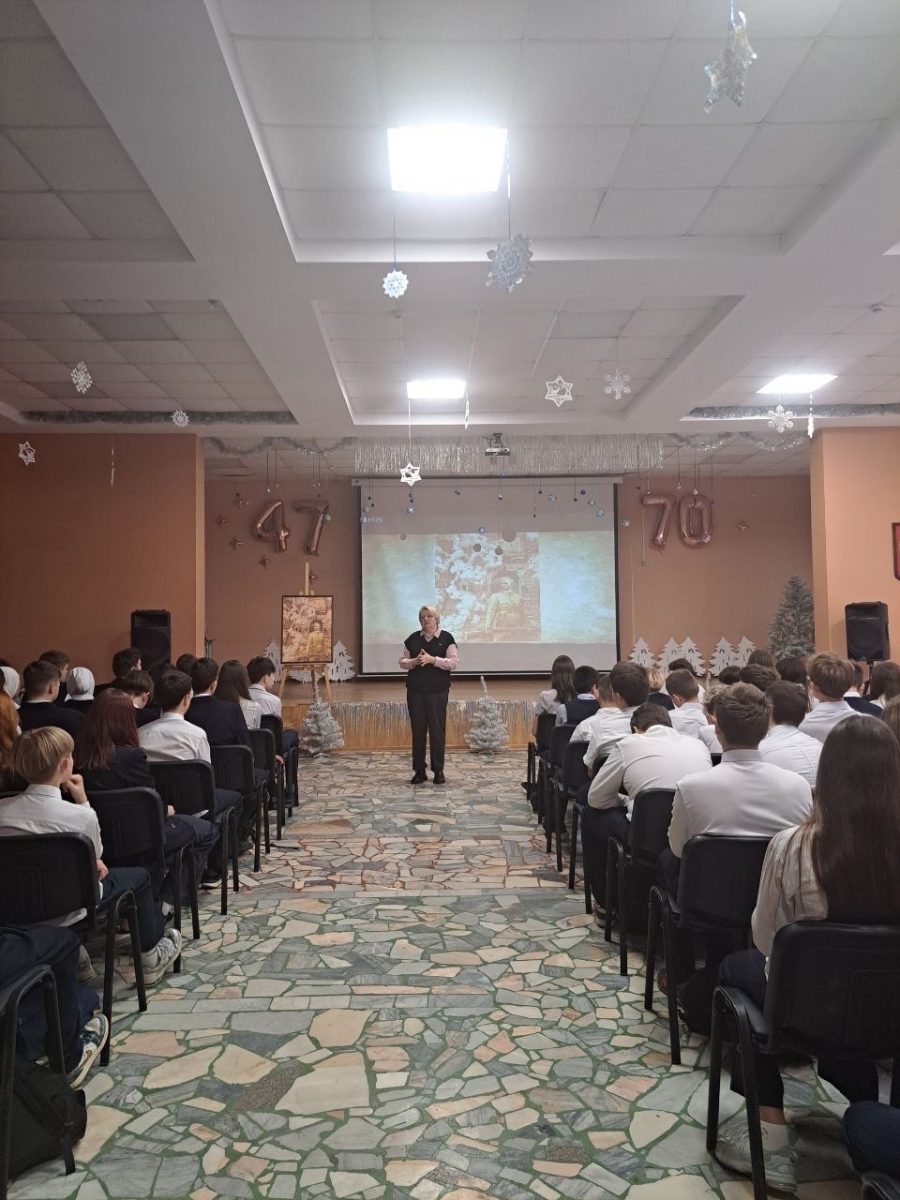 Специалист музея Людмила Пантелеева провела выездную встречу для школьников — мероприятие «Солдат вечности» для учеников МБОУ СОШ №47 города Пензы.