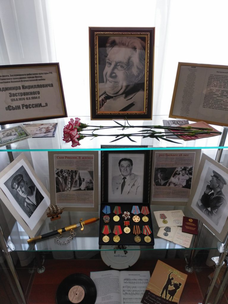 Сегодня в Губернаторском доме начала работать выставка «Сын России…», посвящённая 94-летию со дня рождения поэта, участника Великой Отечественной войны, Заслуженного работника культуры и почётного гражданина города Пензы Владимира Кирилловича Застрожного. В памятной экспозиции представлены фотографии, боевые награды, сборники его произведений, а также скульптура Н.М.Мордовина «Восемнадцать», посвящённая одноимённому стихотворению, лёгшему в основу знаменитой песни, ставшей символом целой эпохи и нашей области в частности. На выставке также экспонируются живописные произведения в сопровождении стихов автора. Владимир Застрожный долгие годы возглавлял Областной дом народного творчества, был ведущим режиссером областных празднеств, народных гуляний и концертов.