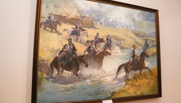 Выставка «Со славой к Победе» демонстрирует посетителям батальный жанр в живописи. В экспозиции представлены работы членов Творческого союза художников России, Российской академии художеств и Студии военных художников имени М. Б. Грекова.