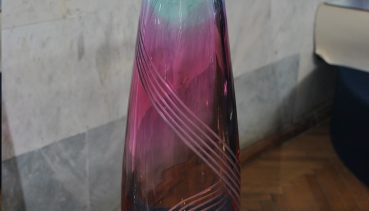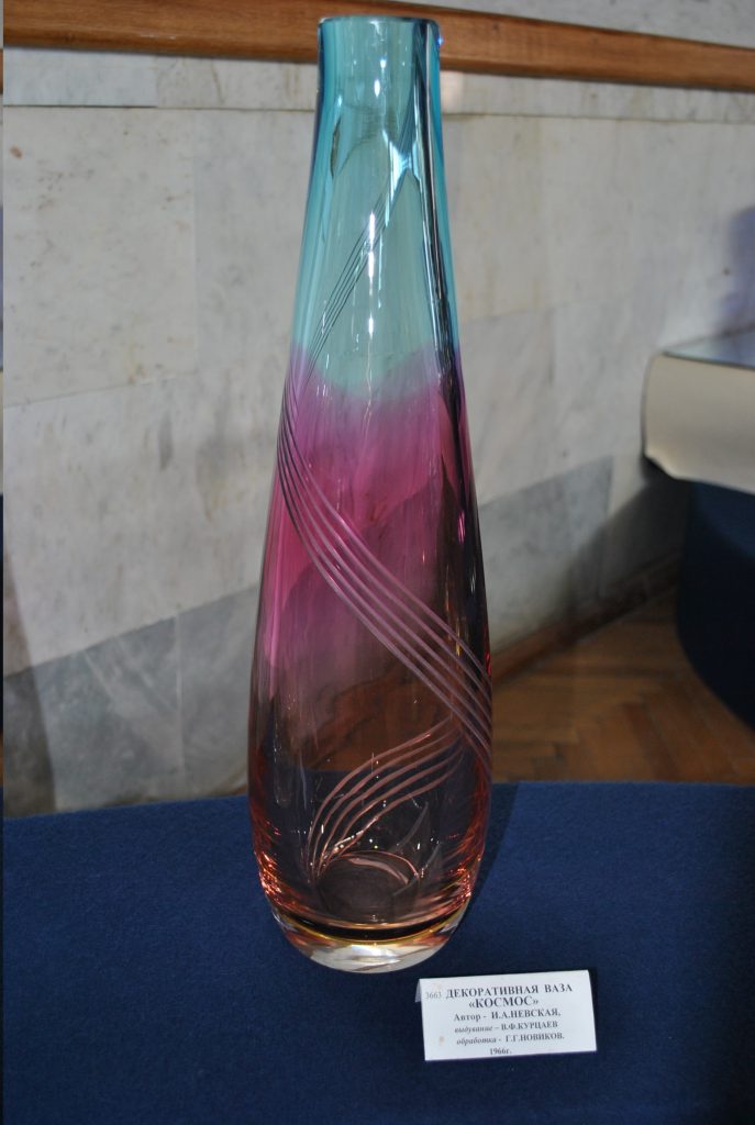 12 апреля 1961г. впервые человеком был совершен полет в космос. В коллекции Музея стекла и хрусталя представлены вниманию посетителей различные экспонаты космической тематики. Среди них – декоративные вазы «Космос», авторами которых являются Ирина Александровна Невская и Надежда Павловна Матушевская. Выработку выполнял Василий Федорович Курцаев, а выдувание – Георгий Григорьевич Новиков.
