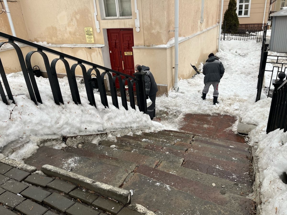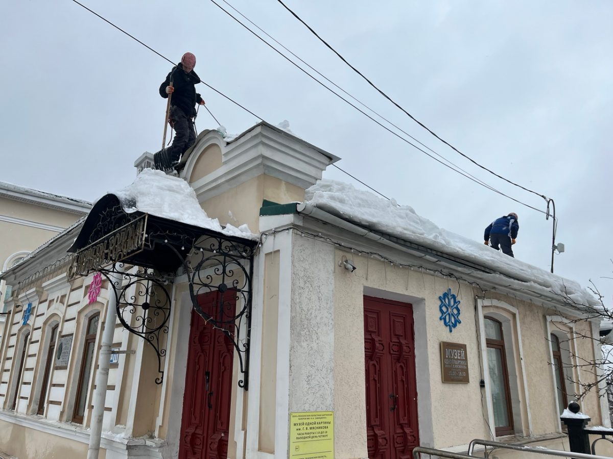 Сегодня был проведен комплекс работ по расчистке крыши Музея одной картины им.Г.В.Мясникова. Альпинисты выполнили очистку кровли от снежных масс и наледи, а сотрудники хозяйственного отдела галереи убрали сброшенный снег с прилегающей территории.