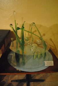 В Музее стекла и хрусталя собрана большая коллекция современного художественного стекла. В дни симпозиумов, проходящих почти ежегодно в г. Никольске, известные художники-стекольщики и студенты, которые только начали постигать эту профессию, работая на стекольных предприятиях города, создают совершенно невероятные художественные композиции, используя самые разные техники изготовления. Очень часто в настоящее время стали использовать склейку элементов композиции и происходит это не всегда удачно. Бывает так, что художники уезжают, а работа оказывается потом не востребованной из-за неудачной склейки, попросту говоря, расклеивается и оседает в недрах запасников из-за невозможности экспонирования. Сегодня нам повезло, приехала автор работы «Шумел камыш», начинающая художница из Москвы Ася Шалимова. Она была участником Молодёжного фестиваля и VIII Международного симпозиума по художественному стеклу в Никольске. Одну работу Аси тоже постигла неудача: части композиции расклеились. Мы попросили её восстановить и к нашей радости она согласилась. Асе помог в реставрации молодой выдувальщик, никольчанин Сергей Бацанин, который тоже участвовал в создании этой композиции. Теперь «Шумел камыш» можно экспонировать на выставках современного стекла. Сейчас в экспозиции первого этажа Музея стекла и хрусталя представлены две работы этого молодого творческого союза «Зима близко» и «Наутилус», о которых мы уже писали на сайте.
