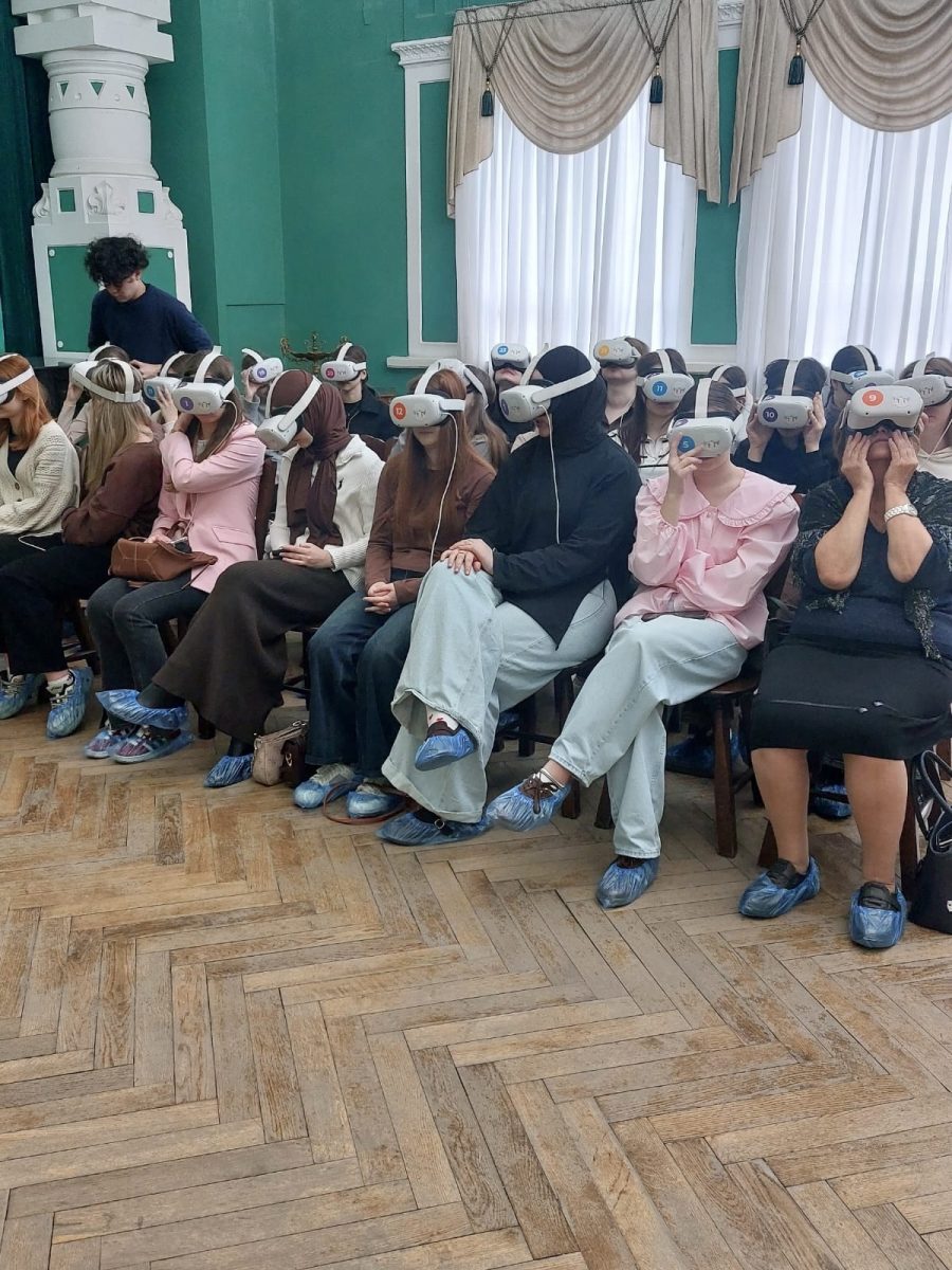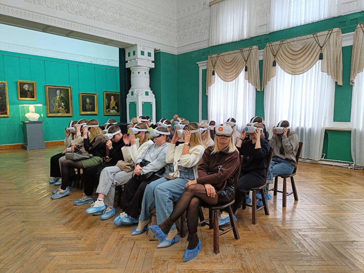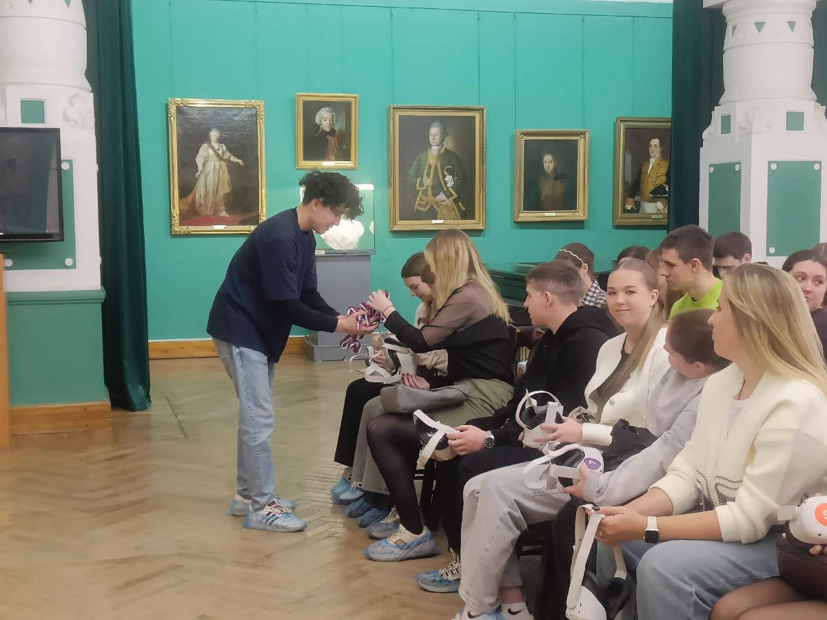 Затем посетители получили ленты с триколором и посмотрели фильм в очках виртуальной реальности «Великая Победа. Города-герои».