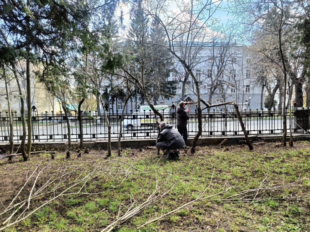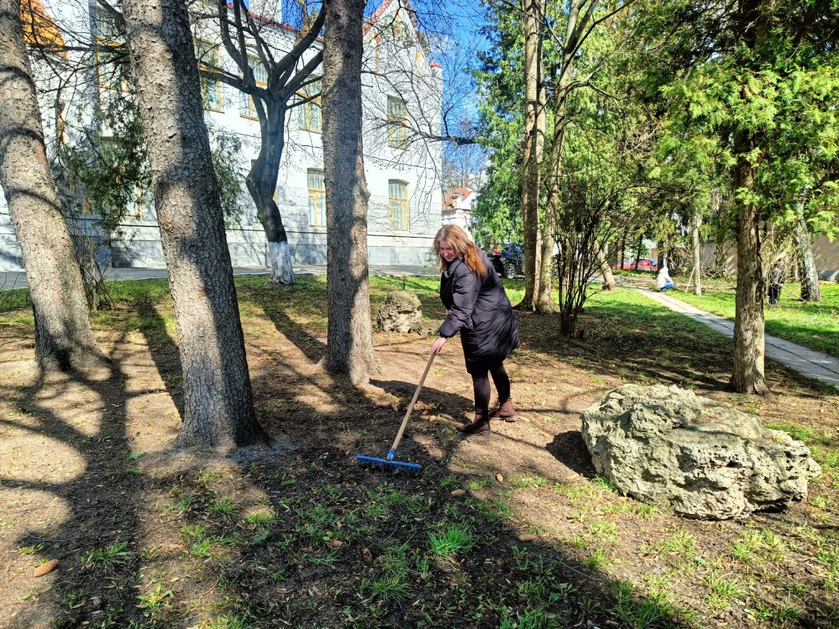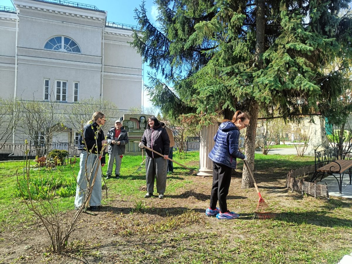Мы подрезали кроны деревьев, убрали последние напоминания о зиме в виде прошлогодних листьев, а также подмели дорожки на территории галереи.
