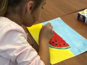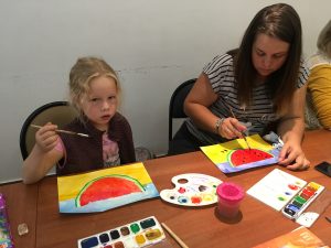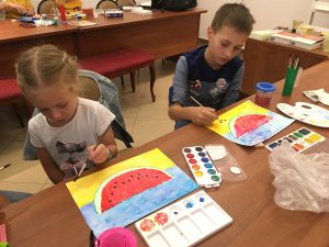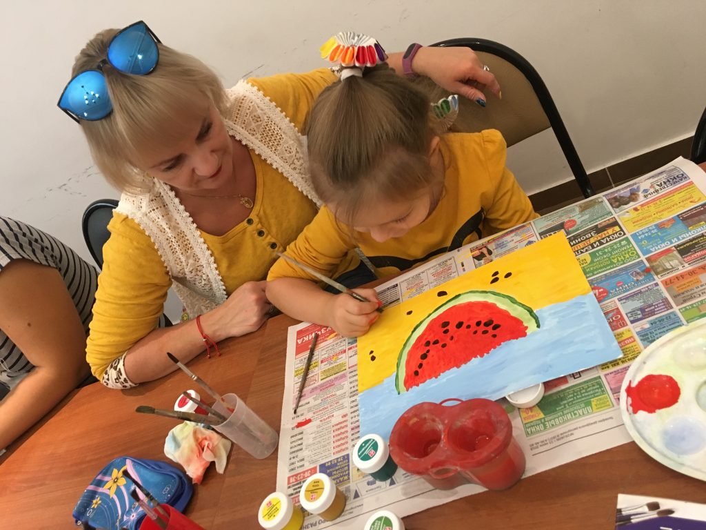 В семейной студии «Школа радости» сегодня, 16 сентября, продолжился марафон первых занятий! Мы с ребятами вспоминали наше лето, какое оно было, что мы делали, где отдыхали, и чем оно нас порадовало! Это лето богато на самые разные урожаи, и мы решили запечатлеть на память о лете самую летнюю ягоду на свете – арбуз! Яркие, красочные, сочные арбузики будут поднимать настроение во время осенних дождей и зимних вьюг, а мы будем ждать новой встречи с летом!