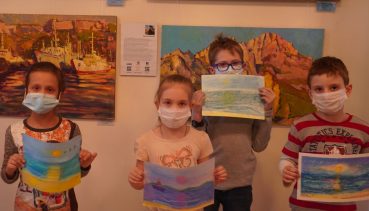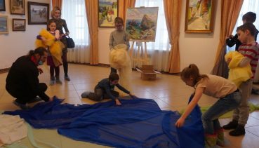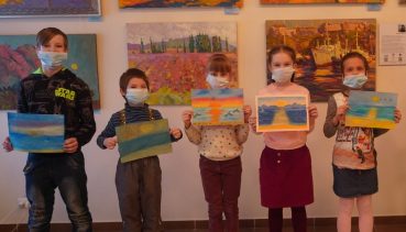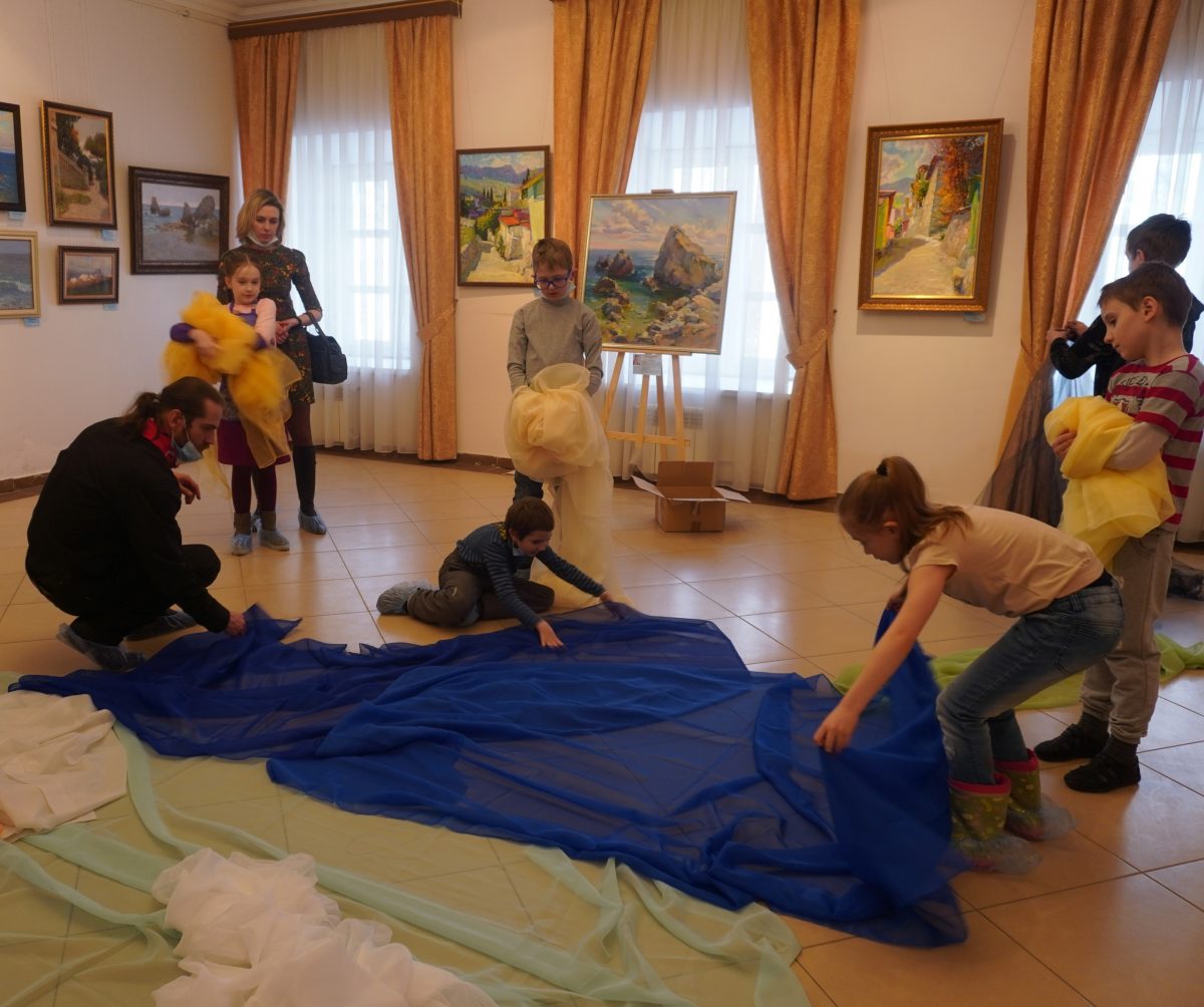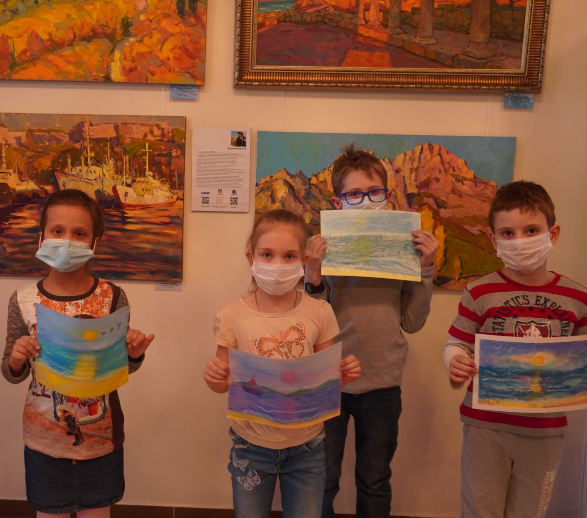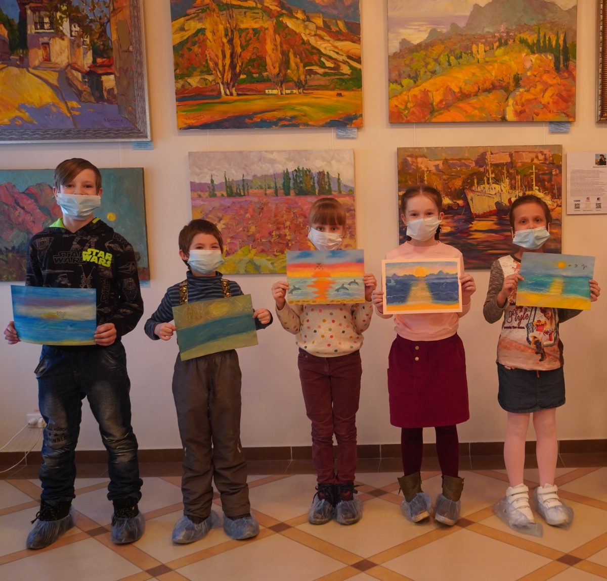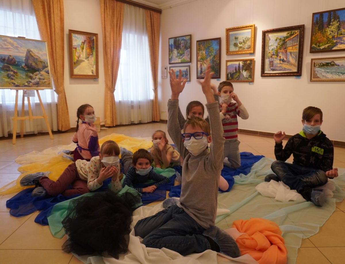 ?Вместе с ребятами мы познакомились поближе с картинами художников на выставке » Очарованные Крымом», совершили путешествие в мир жанра марина и даже сами попробовали создать неповторимый морской пейзаж из газовой ткани.