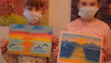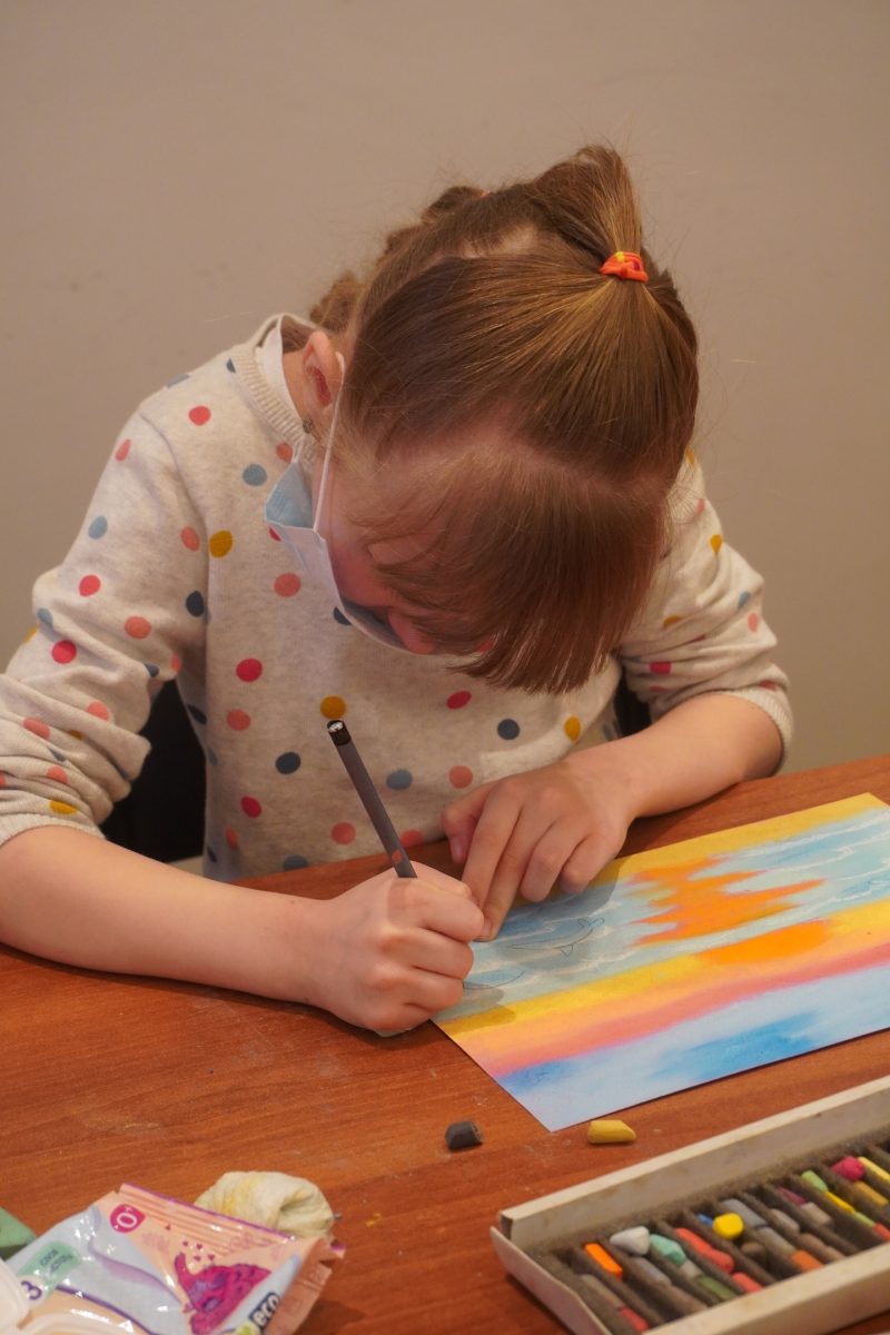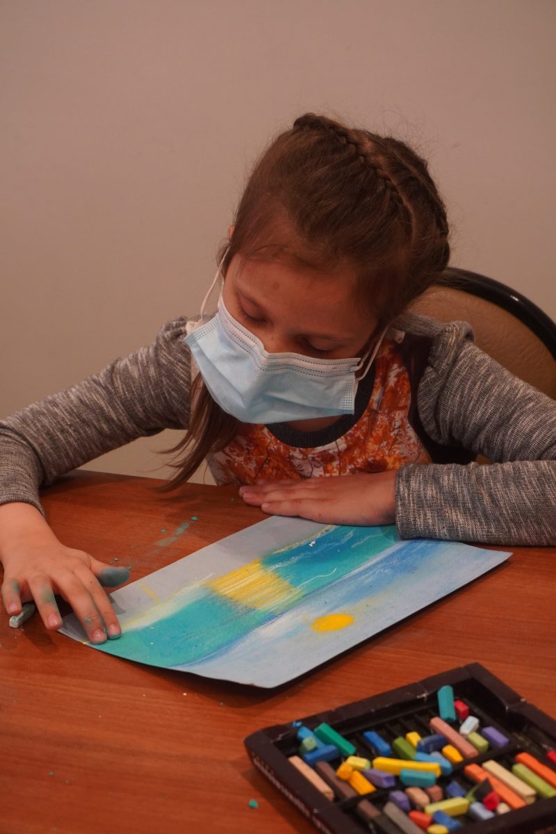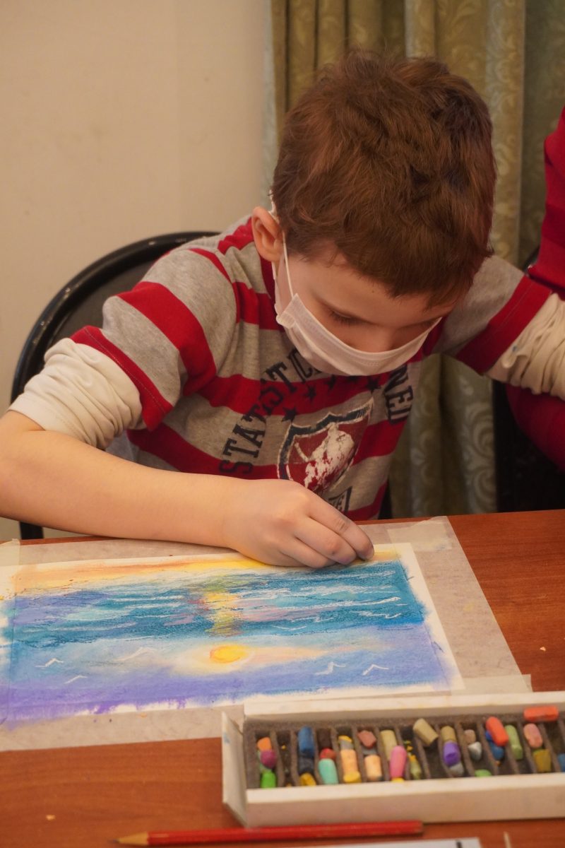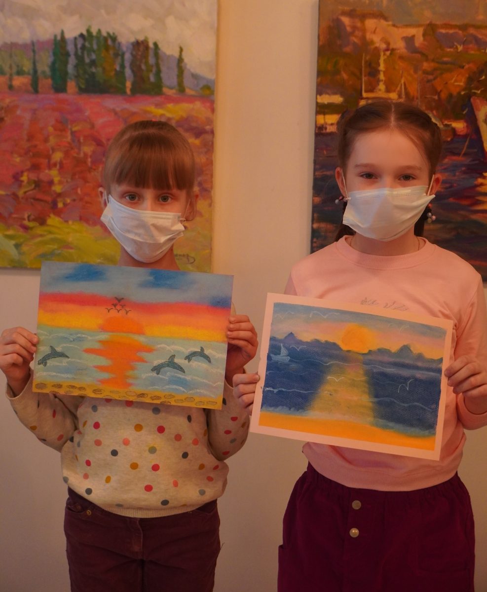 ? На практике дети работали в технике сухой пастели. У нас получились картины, демонстрирующие разные состояния в пейзаже: туманное морское утро, светлый солнечный полдень, романтический закат с пенистыми волнами, парусником, чайками и дельфинами.