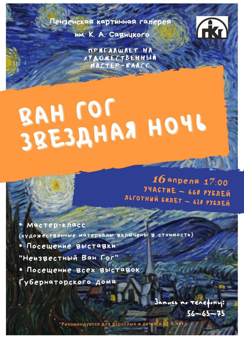 ? Мы приглашаем вас в пятницу, 16 апреля, в 17-00 на художественный мастер-класс по мотивам картины Винсента Ван Гога «Звездная ночь», который пройдет в Губернаторском доме.