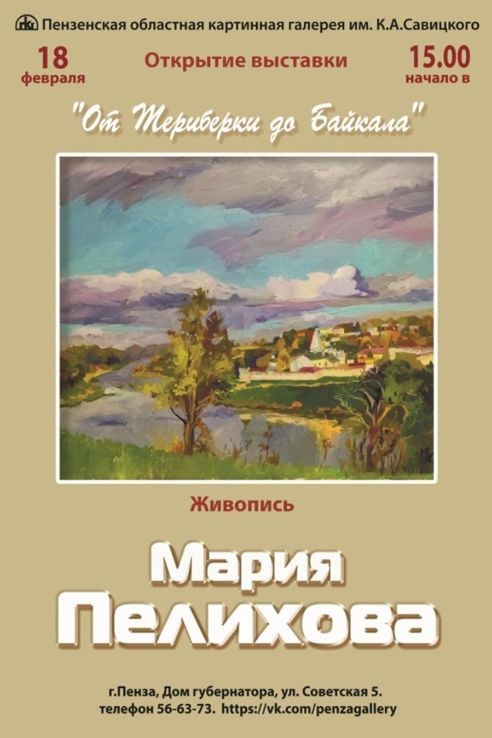 18 февраля в 15:00 в Губернаторском доме (ул. Советская, 5) состоится открытие персональной выставки «От Териберки до Байкала» молодой пензенской художницы, преподавательницы живописи и композиции, а также участницы 22 выставок Марии Пелиховой. Одна из персональных экспозиций художницы уже состоялась в Пензенской картинной галерее в 2018 году.