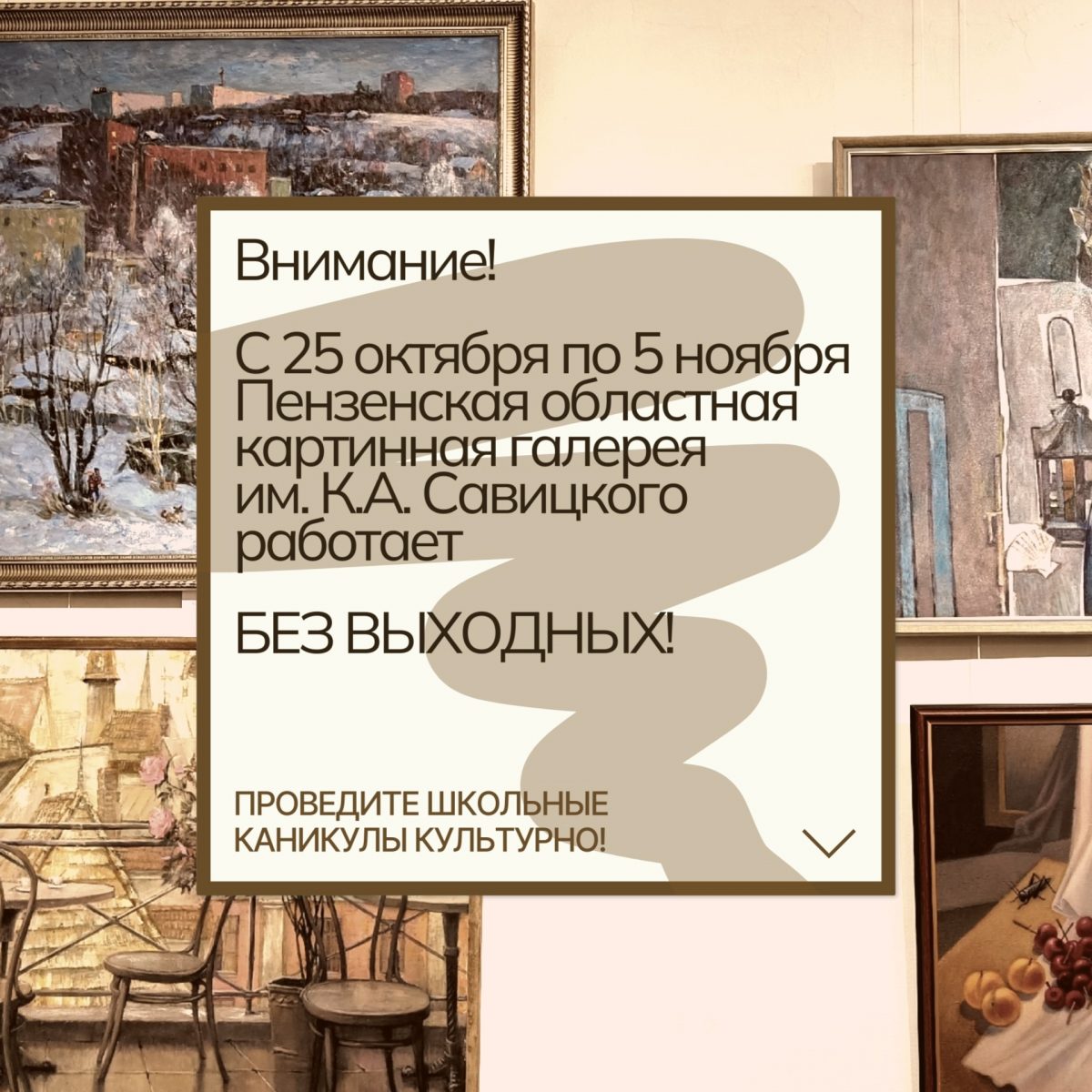 🎉 Внимание! С 25 октября по 5 ноября Пензенская областная картинная галерея им. К.А. Савицкого работает БЕЗ ВЫХОДНЫХ! 🎉